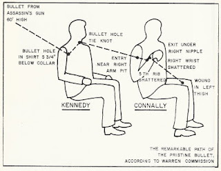 The Fall take issue with several aspects of the Warren Commission’s findings, particularly in their explanation of the shots fired by Oswald. According to the Warren Commission, Oswald’s first shot missed his target but Oswald’s second shot hit his target and then some. This shot, which supposedly hit both Kennedy and Gov. John Connally, who was riding in the seat in front of JFK, has come to be known by conspiracy theorists as the “Magic Bullet Theory” because of the strange trajectory the bullet would have had to have taken to have had the effect suggested by the Warren Commission. The “theory of zigzag bullet line” and the “theory of triangle bullet lines/Turning in circles twice”, is how “Oswald Defence Lawyer” mocks the Warren Commission’s description of Oswald’s second shot.